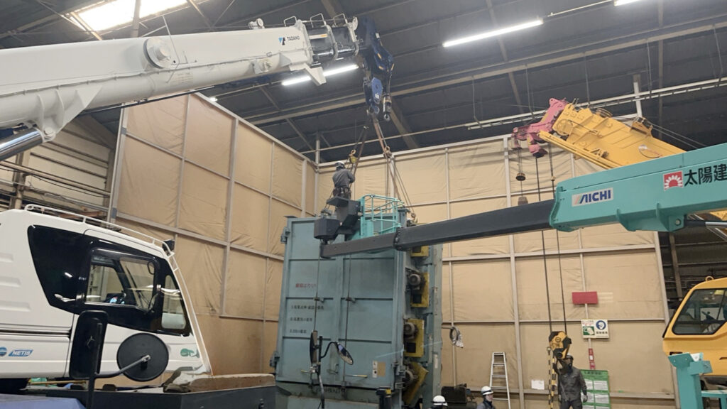 搬出通路が狭い条件下では、クレーン2台を用いた反転作業を含めた安全な手順で、確実に撤去・移設対応いたしました。